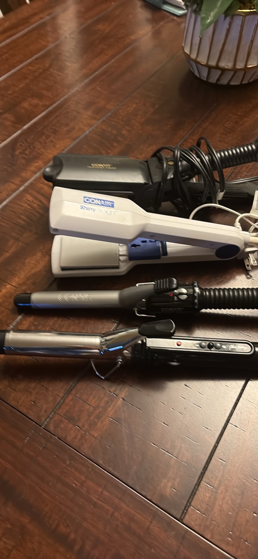 2 curling irons, & 2 Flatirons all brand names & gently used & in good working order.